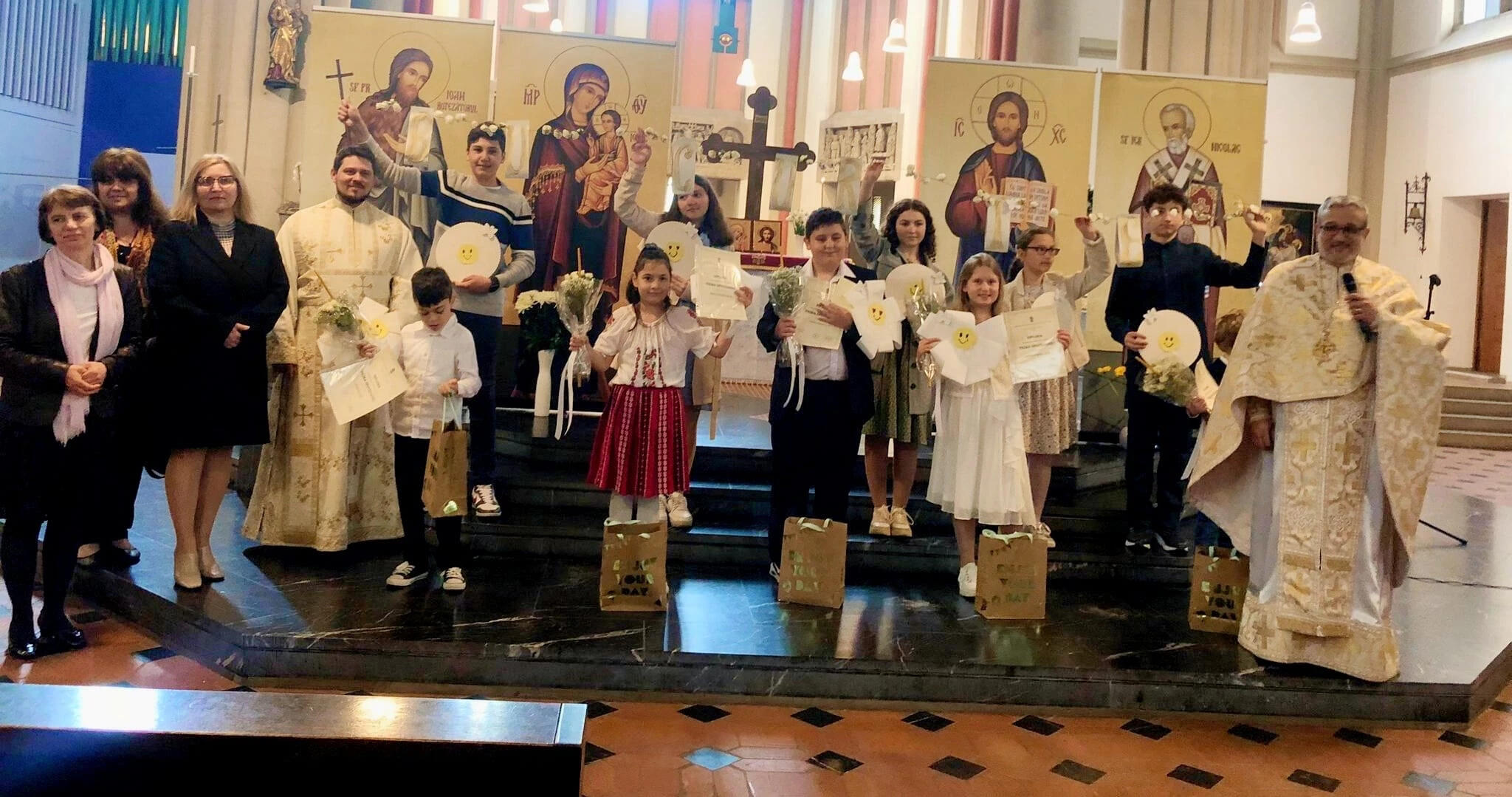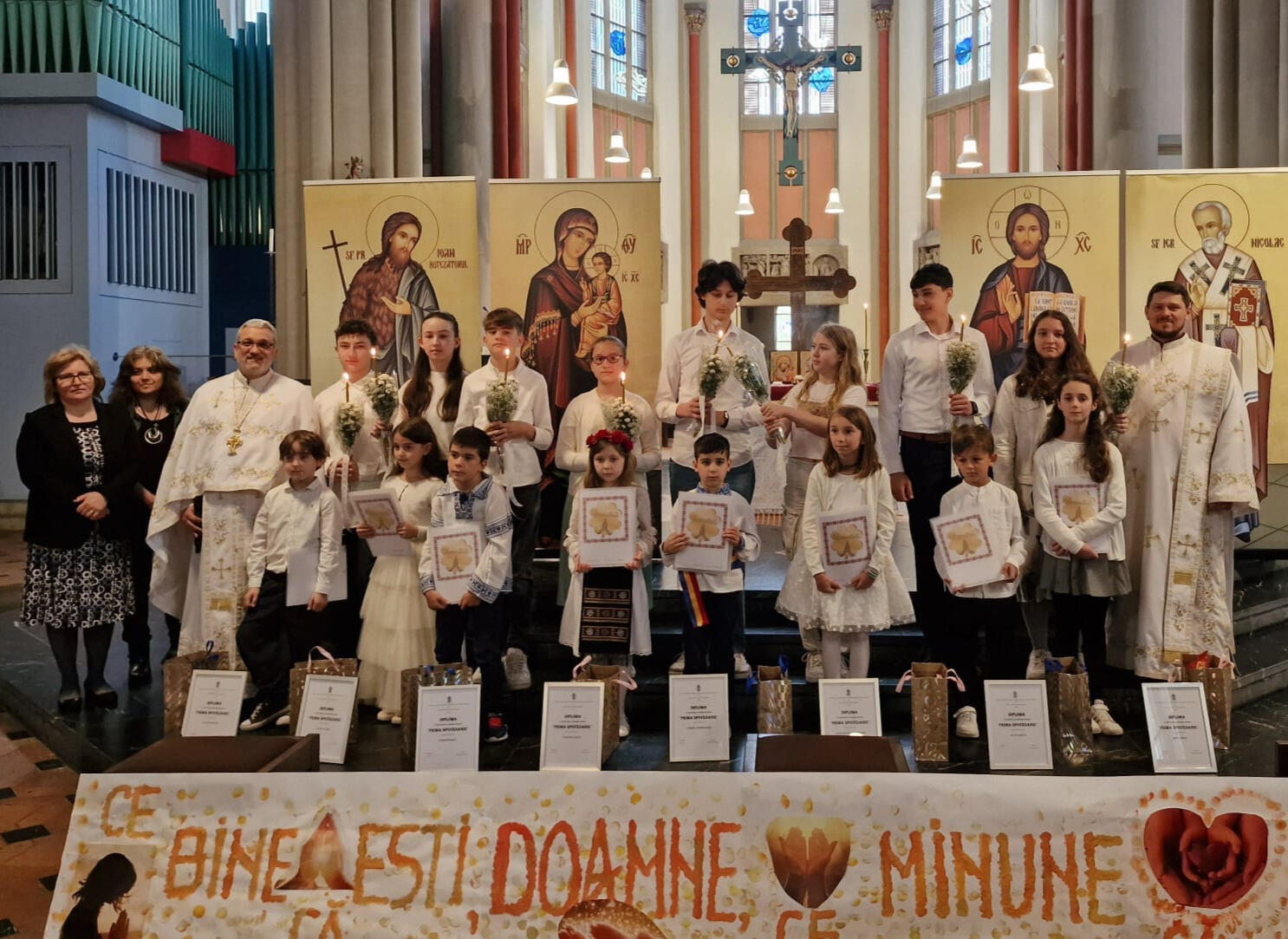 Am Sonntag, den 14. Mai 2023, feierte die Gemeinde „Heilige Dreifaltigkeit“ in Düsseldorf die Freude der Kinder, die am katechetischen Programm „Erste Beichte“ teilgenommen haben.Wie jedes Mal hatten die Kinder, die an den wöchentlichen Kursen der Sonntagsschule teilgenommen und sich in diesem Schuljahr zum ersten Mal in unserer Gemeinde gebeichtet haben, ein ausschließlich ihnen gewidmetes Festprogramm. Nach dem Sprechen des Glaubensbekenntnisses und des Gebets „Unser Vater“ vor der gesamten Gemeinschaft waren die Kinder die ersten, die die Heilige Kommunion empfangen haben.Nach der Heiligen Liturgie legte jeder Teilnehmer ein Glaubenszeugnis über die christliche Freude ab, erhielt ein Teilnahmezertifikat am Programm „Erste Beichte“, Geschenke und die Wertschätzung der Gemeinschaft für ihre katechetische Vorbereitungsbemühungen. „Dies ist ein erster Schritt zur bewussten Integration der Kinder in die Gemeinde. Die Ergebnisse dieses Programms sind sehr schön. Die Kinder erlangen das Bewusstsein, dass sie auf eine besondere Weise zu dieser Gemeinschaft gehören und schätzen die Freude, gemeinsam an der Heiligen Liturgie und den Kursen der Sonntagsschule teilzunehmen, viel mehr“, bezeugte der Erzpriester Iosif-Cristian Rădulescu.Auch in diesem Jahr haben die Lehrerinnen Ioana Pașca und Simona Ilea Pop die Kinder mit viel Hingabe vorbereitet, diese Hingabe ist der Schlüssel zum Erfolg des gesamten katechetischen Programms. Die dekorative Gestaltung wurde geschickt von Lehrerin Miruna Sandu übernommen.Das Ereignis stellt ein wahres Fest für die Gemeinschaft dar, die jedes Jahr darauf wartet, die Freude der Kinder an der Teilnahme am Gemeindeleben zu sehen.