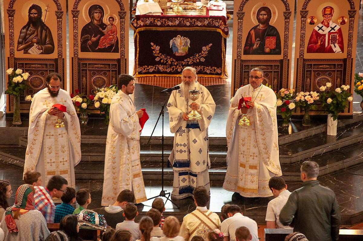 Am Sonntag, den 4. Juni 2023, feierte die Gemeinde "Heilige Dreifaltigkeit" in Düsseldorf ihr Kirchweihfest, ebenfalls in Anwesenheit des Hochwürdigsten Herrn Metropoliten Serafim, der den Erzbischofsgottesdienst in einem Konzil von Priestern und Diakonen leitete.Nach dem Abschluss der Heiligen Liturgie zelebrierte Seine Eminenz die Vesper der Pfingsten, wodurch die Gebetsatmosphäre dieses großen Festes der Herabkunft des Heiligen Geistes verstärkt wurde.Des Weiteren predigte der Hochwürdigste über die Bedeutung des Wirkens des Heiligen Geistes im persönlichen Leben der Gläubigen und im Leben der kirchlichen Gemeinschaft, indem er betonte, dass nur durch die Gemeinschaft mit Gott eine vollkommene Gemeinschaft untereinander möglich ist. Sowohl der erzbischöfliche Gottesdienst als auch die Lehrpredigt brachten den zahlreich anwesenden Gläubigen große Freude.Das Patronatsfest der Gemeinde endete mit einem Kuchenbasar anlässlich des Sonntags der Eltern und Kinder. Organisiert durch den Beitrag der Eltern und Kinder, zielte dieser Kuchenbasar darauf ab, einem kranken Kind namens Ștefan zu helfen, einem kleinen Kämpfer, der mit schweren Gesundheitsproblemen konfrontiert ist.Die Anwesenheit des Hochwürdigsten Herrn Metropoliten Serafim und des Konzils von Priestern und Diakonen, sowie die aktive Teilnahme der Mitglieder unserer Gemeinschaft machten das Patronatsfest der Gemeinde zu einem Ereignis voller Freude.